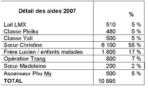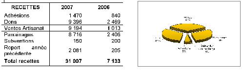 Commentaires : Les recettes de l'association en 2007 proviennent essentiellement des dons et des ventes artisanales réalisées grâce à l'envoi de produits artisanaux par Melle Ho Thi Kim Dung. En ce qui concerne ce point, il faut souligner que cela a été permis par une grande mobilisation des adhérents des Pyrénées Orientales qui ont organisé des ventes sur leurs lieux de travail, à l'occasion d'expositions (Banque Populaire du Mas Guérido, Office de Tourisme d'Alénya), de marchés divers… Il s'agissait dans un premier temps de rembourser au plus vite le colis envoyé par Melle Ho. Les produits les plus faciles à vendre ont été sans conteste les écharpes et autres produits en tissu. Reste une large part du colis consistant en plateaux, vases, assiettes, tableaux, beaucoup plus difficiles à écouler.