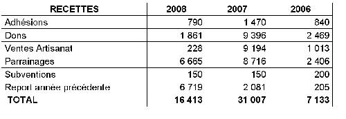 Commentaire : les adhésions sont en chute ! de même que les dons. La principale raison est que cette année, nous n'avons pas effectué d'appel de fonds comme pour la petite Trang ou pour Sœur Christine en 2007.